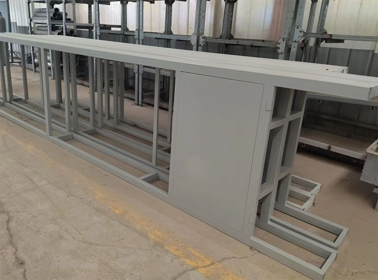 2.4、移动房体支架:包括垂直框架、房顶框架、密封布压板、内部斜撑、从动轮,是移动房体的主要钢结构支架系统。用于房体长度方向伸缩受力和PVC布的固定。***后一套支架为固定支架,固定在墙壁或地面。其余支架的垂直支架底座为被动滚轮,用于支撑支架和减少移动阻力。垂直支架与横梁采用非标60×40×1.5矩形管焊接矩形框架结构,每隔970mm拉横撑。横撑之间采用50×30×1.5矩形管拉斜撑。