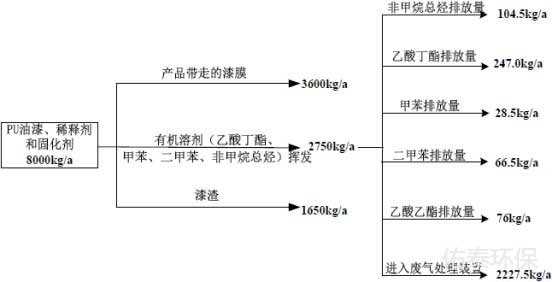 达产情况下PU油漆年用量为5t、稀释剂年用量为1t、固化剂年用量为2t,按含量计算易挥发物质非甲烷总烃0.550t/a、乙酸丁酯1.30t/a、甲苯0.150t/a、二甲苯0.350t/a、乙酸乙酯0.40t/a,其他为树脂等固化剂。根据喷油漆涂料用量核算表(表2-4),喷漆进入产品的量为3.600t/a。PU油漆、稀释剂和固化剂物料平衡情况见图2-1。