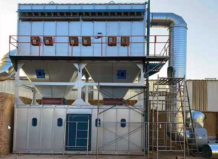 中央除尘设备是将含有木屑颗粒的气流经过风机运输送至布袋过滤器的导流仓中,气流在导流板的作用下流速降低,较重的木屑颗粒在重力的作用下落入惠仓里,其中较轻细的粉尘随气流向上吸附在滤袋的外表层面上,经过布袋的过滤后,干净的气体进入排风室中并排到外面。随着过滤工况的持续,积累在滤袋外表面上的粉尘会越来越多,就会增加系统的运动阻力,降低系统的除尘效率。脉冲幅度和频率设定完成后,在工作的过程中,系统会自动完成过滤布袋的清灰,从而大大增加滤筒的过滤效率并延长过滤布袋的使用寿命。
