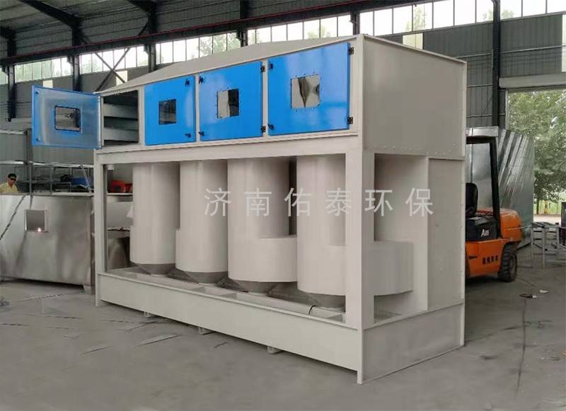 2、气旋喷漆柜移动伸缩房固定端设置一台6米长气旋喷漆柜,喷漆产生的漆雾颗粒,在风机的迁引下,一部分漆雾颗粒吸附在水帘上面并落入水池中。绝大部分漆雾颗粒经过气旋装置及漆雾分离装置的碰撞,***后也落入水池之中。漆雾去除率达到95%以上。从页排出不含漆雾颗粒的有机废气。为后续催化燃烧设备的正常运行,提供良好的预处理条件。