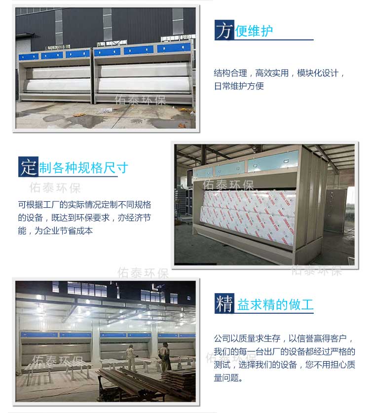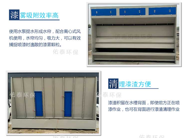 二、水旋喷漆柜有以下特点:1、良好的漆雾净化效率,采用风机的离心力涡流方式,漆雾的净化效率分别为:塑脂涂料及硝基漆达到94%,三聚氰胺涂料达到95%,