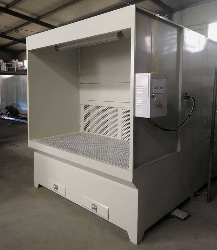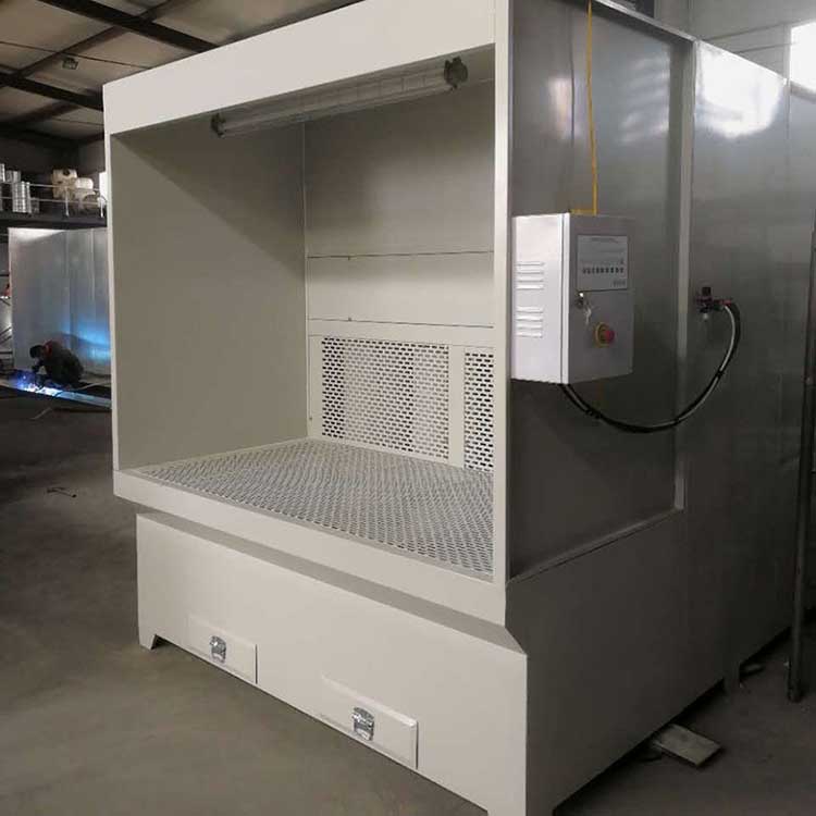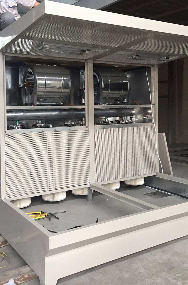 多工位打磨吸尘工作台工作时,把工件放在工作台面上打磨,在排风机的抽吸作用下,将工件上打磨出来的粉尘灰尘等物吸入机内,打磨出来的粉尘不会在操作者的呼吸处停留,而随抽风的气流迅速抽进主机里,带有粉尘的气流通过百味窗透过滤芯排风过滤系统流向机外,粉尘颗粒经过滤芯过滤后掉下主机的集成箱里,干净的空气排出。还有一部分气体通过回风道经过风口棉,再次过滤吹到工作台面,从而达到循环的***佳效果。这样大大改善了工作环境。