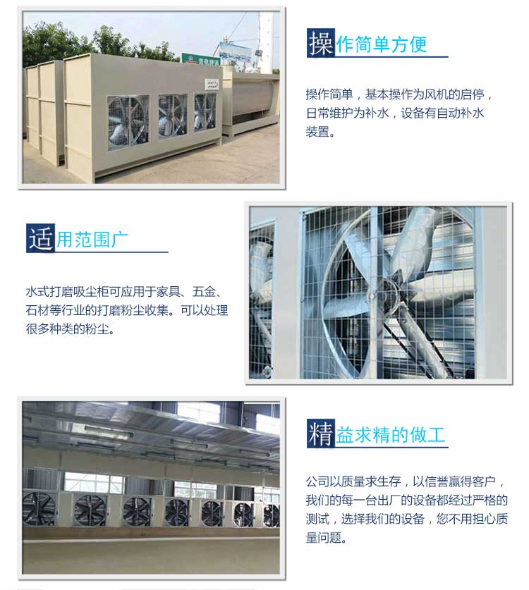 3、工作原理:产品打磨产生的粉尘,经过风机,吸附到打磨柜里面,通过里面的水循环,落到打磨柜的下面。