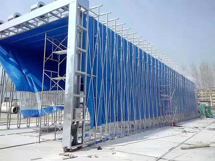 3、伸缩移动喷漆房整体为框架传动结构,每组框架间均有阻燃PVC布密封连接,安装快捷、外形美观,结构精巧,使用方便,制造成本低,节约投资;
