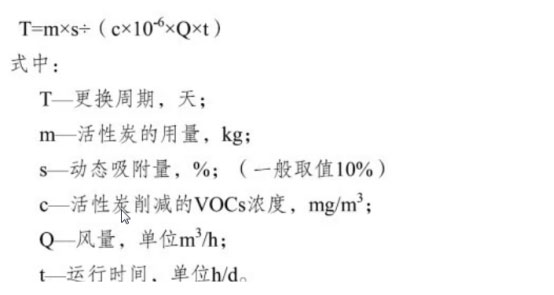 计算示例:某企业,通过活性炭吸附设施处理的VOCs废气风量为10000m3/h,废气进口VOCs浓度为200mg/m3,出口VOCs浓度为40mg/m3(即活性炭削减VOCs浓度为160mg/m3),每日运行时间8小时,活性炭吸附设施填充活性炭1000kg,则更换周期为7天!